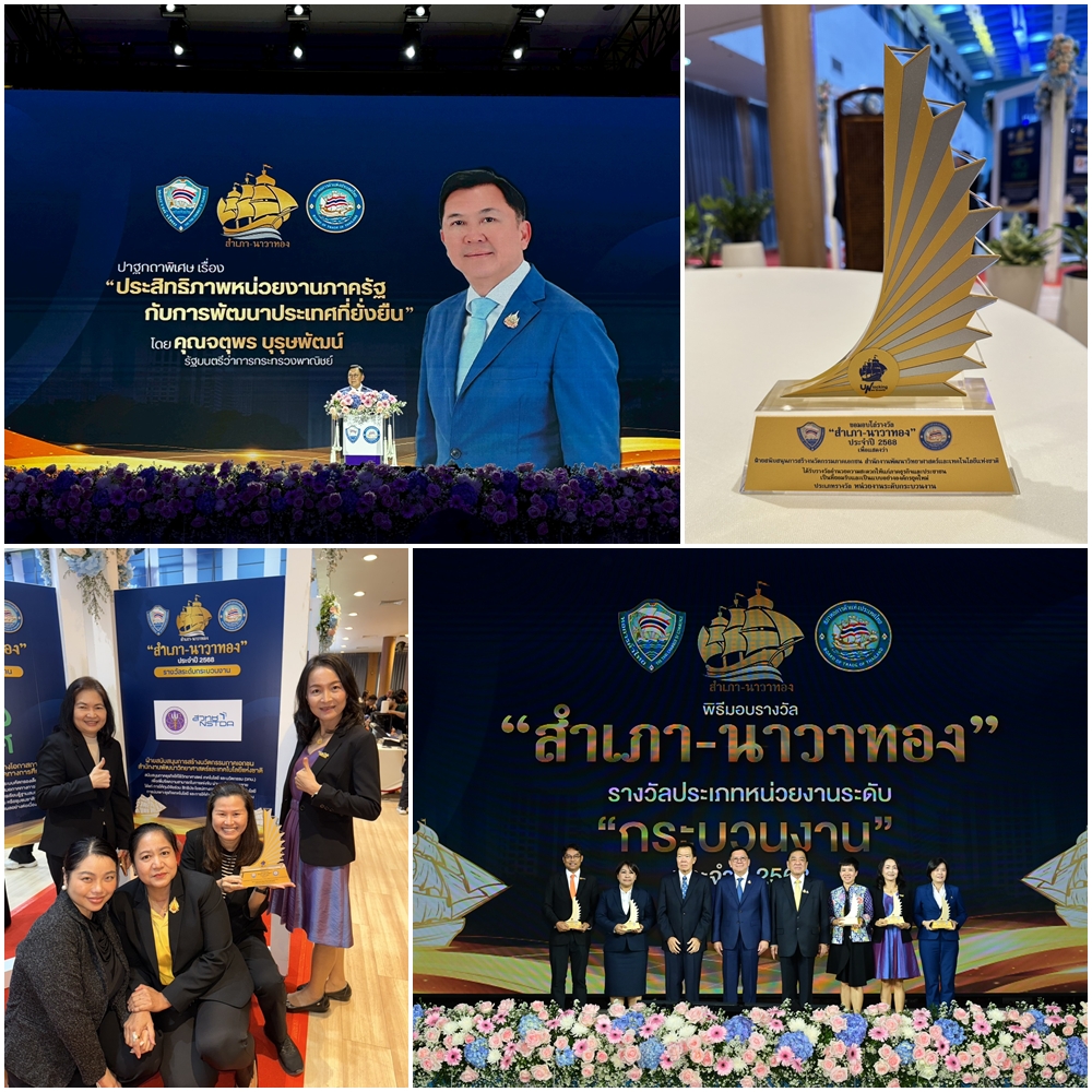 วันที่ 27 สิงหาคม 2568 ดร.นันทิยา วิริยบัณฑร ผู้อำนวยการฝ่ายสนับสนุนการสร้างนวัตกรรมภาคเอกชน (ITAP) สำนักงานพัฒนาวิทยาศาสตร์และเทคโนโลยีแห่งชาติ (สวทช.) รับรางวัล “สำเภา-นาวาทอง” ประเภทหน่วยงานระดับกระบวนการ จาก นายจุตพร บุรุษพัฒน์ รัฐมนตรีว่าการกระทรวงพาณิชย์ โดยเป็นรางวัลที่หอการค้าไทยและสภาหอการค้าแห่งประเทศไทย มอบให้ หน่วยงานภาครัฐที่มีการปรับปรุงกระบวนการทำงานภายในอย่างเป็นรูปธรรม ลดขั้นตอนการทำงาน และอำนวยความสะดวกในการใช้บริการของภาคธุรกิจได้อย่างมีประสิทธิภาพ ณ มหาวิทยาลัยหอการค้าไทย